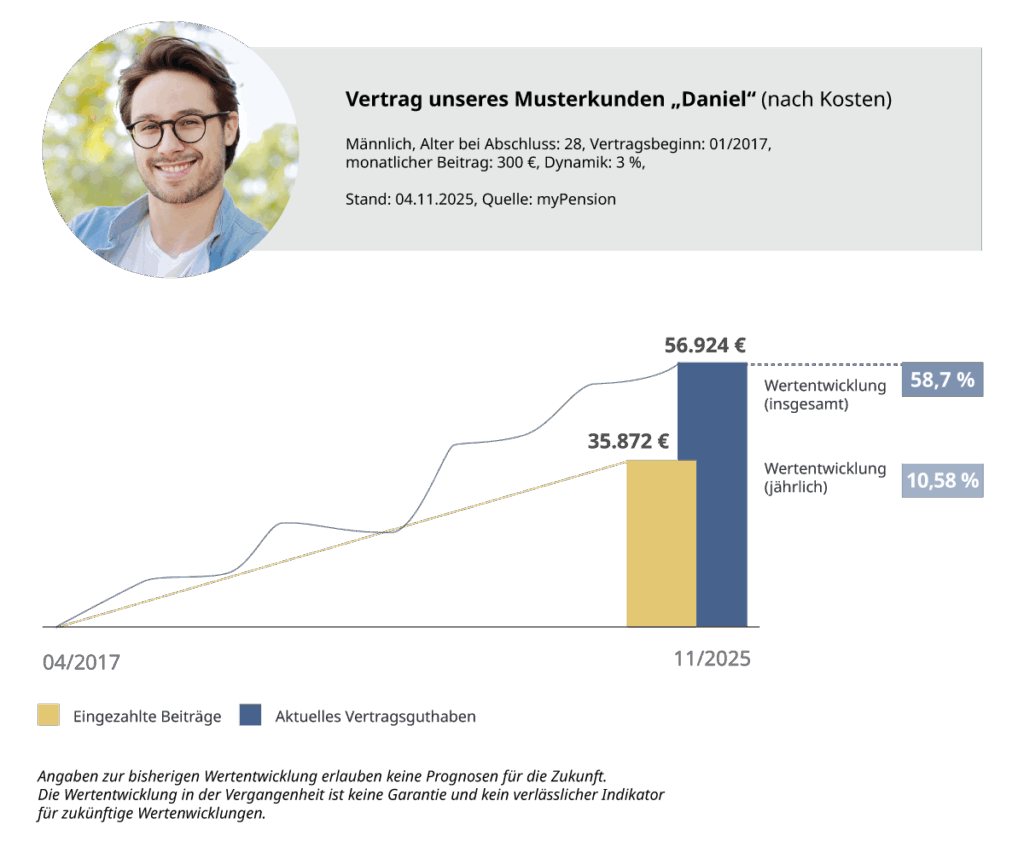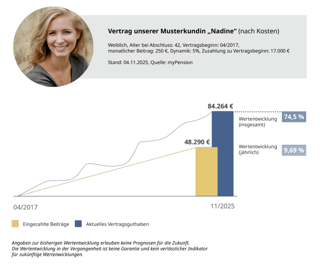 Unsere Musterkundin „Nadine“, die vier Monate später ihren Vertrag eröffnet hat, kommt auf eine jährliche Rendite nach Kosten von 9,69% jährlich.